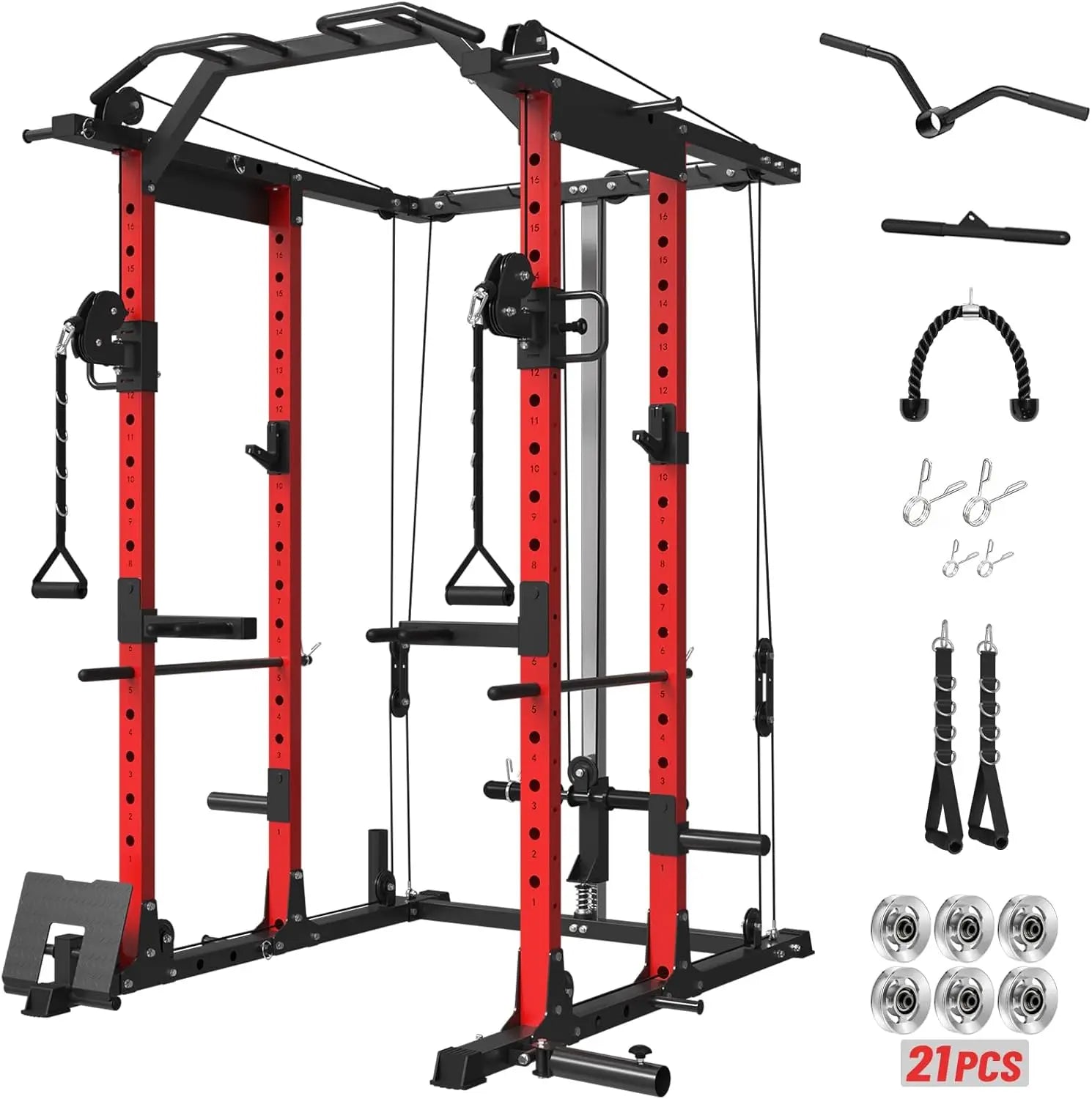 - [ Free & Complete Accessories]: No need to buy the extra accessories because all the accessories come with our home gym power cage. It included: T bar x 1, lat pull down bar x 1, tricep rope x 1, cable bar x 1, cable handle x 2, weight storage pins x 2, J-hook x 2, dip bar x 2, detachable landmine x 1, footboard x 1, barbell spring clamp x 2, safety bar spring clamp x 2