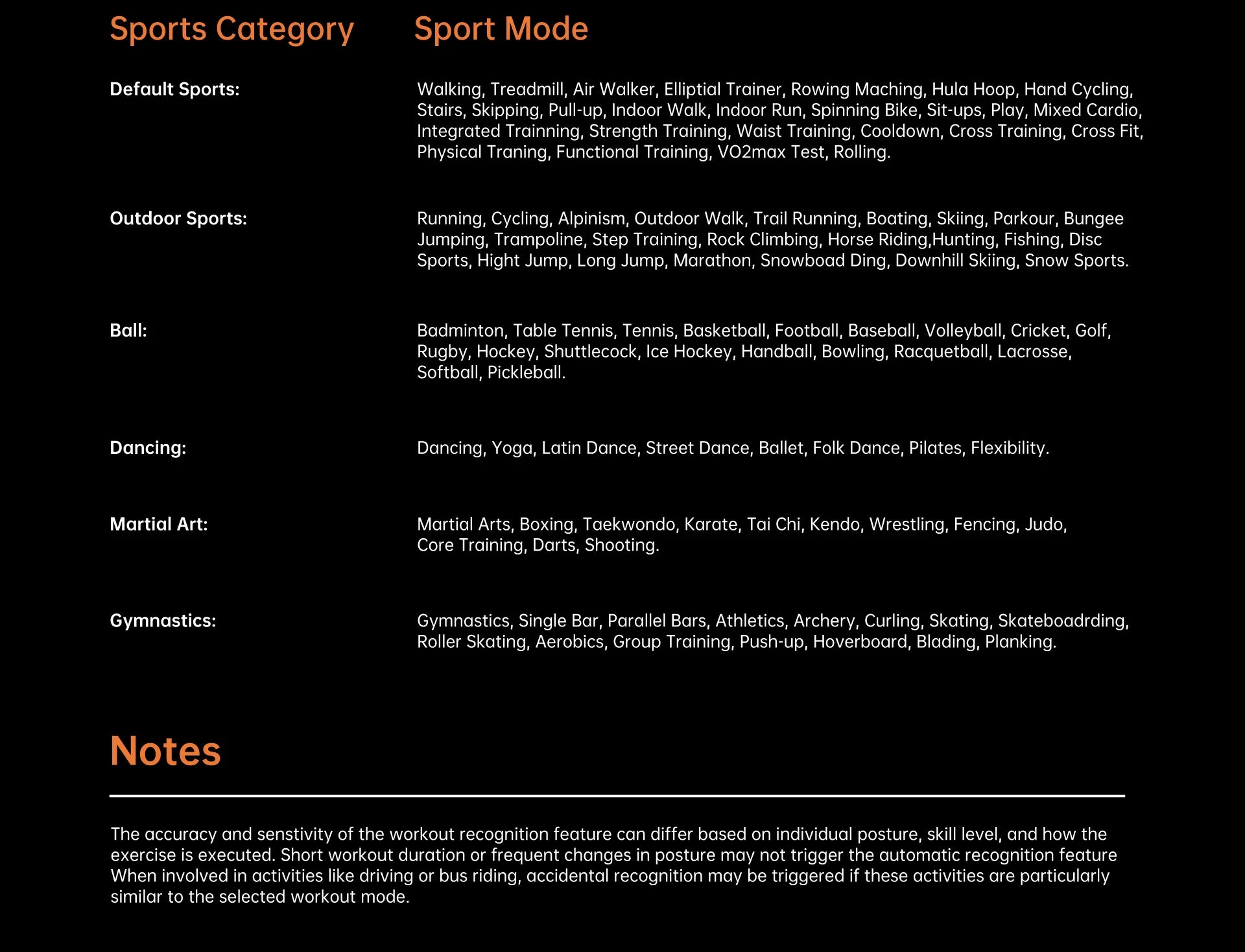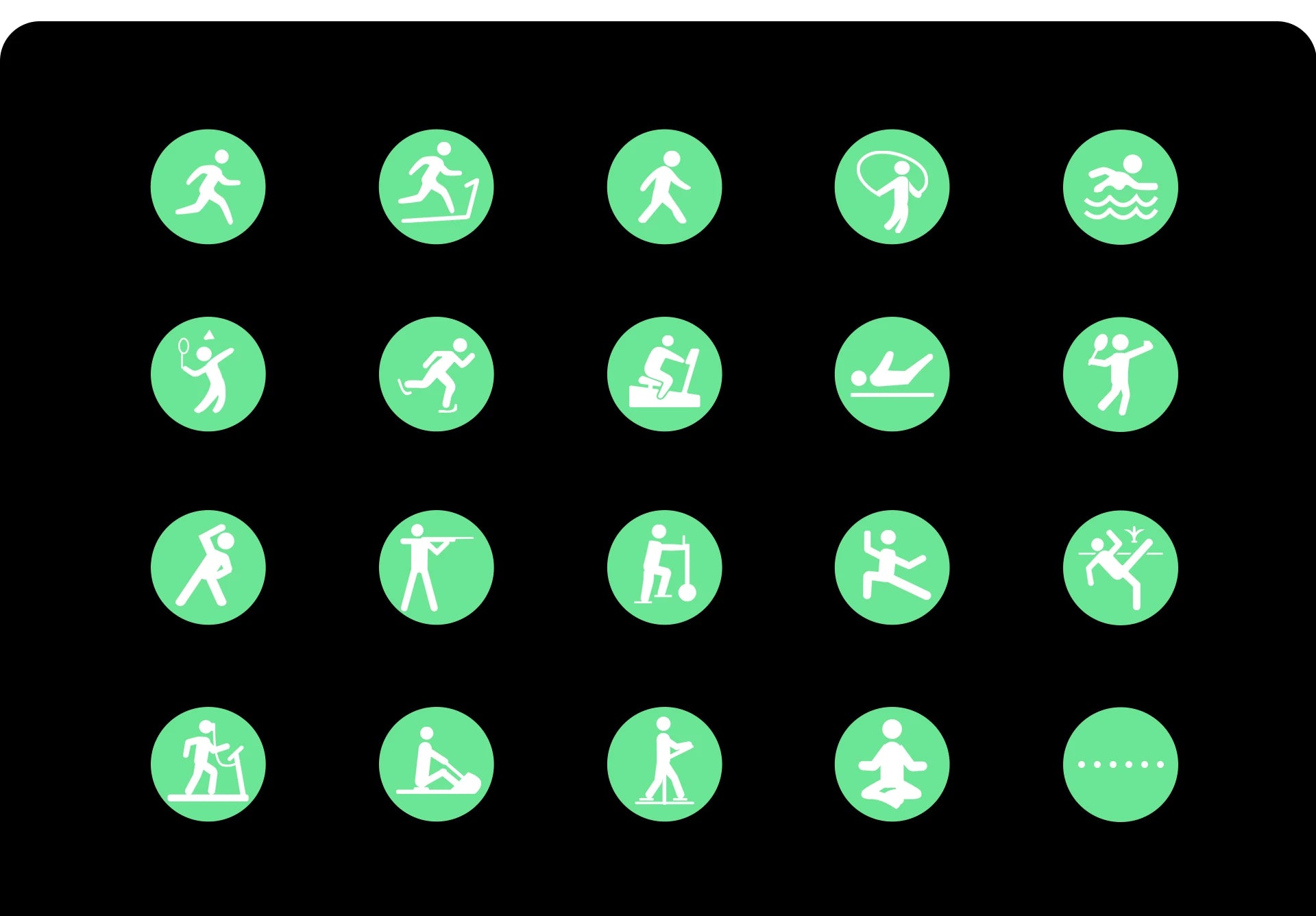 Walking, running, cycling, jump rope, badminton, basketball, football, football, swimming, tennis, rugby, golf, yoga, gym, dancing, baseball, elliptical trainer, rowing machine, cross-country, skiing, bowling, dumbbells, squats, free training, mountaineering.