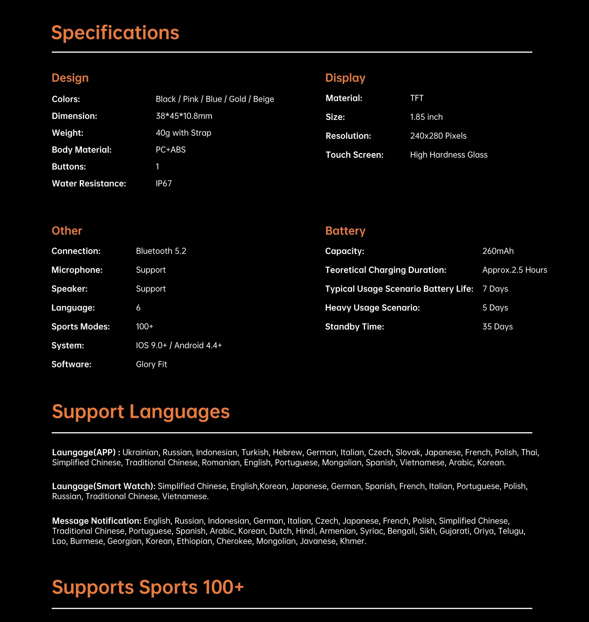 Function: Passometer,fitness tracker,sleep tracker,Message Reminder,Call Reminder,Answer Call,Dial Call,Push Message,24 hour instruction,Alarm Clock,World Time,week,Heart Rate Tracker,Interactive Music,Thermometer,Calendar,Countdown,Calculators