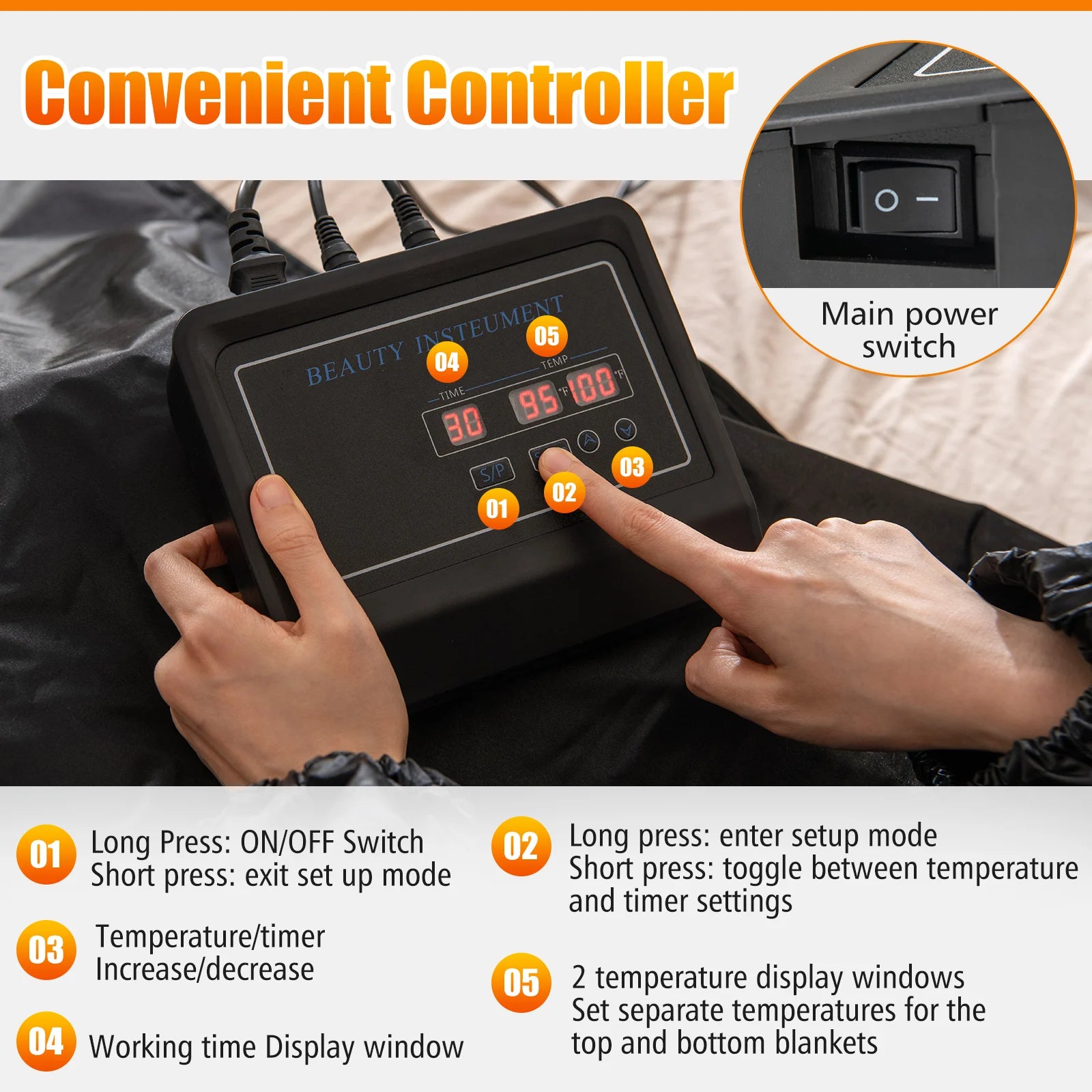 Efficient infrared therapy reduces stress and promotes full-body relaxation Crafted with 5-layer waterproof material for safety & easy maintenance Featuring flame-retardant cotton layer and overheat protection 132-180 °F temperature range will boost detox and fat loss 121-131 °F temperature range will reduce inflammation and pain 90-120 °F temperature range will relax mind and body 13-level timing function allows you to set the perfect duration Top & bottom separate temp control is friendly for different body parts Easy-to-operate controller enables you to effortlessly adjust the ideal setting Equipped with 5 disposable detox wraps to speed up detox and weight loss Arm sleeves ensure better heat retention and improved convenience Included carrying bag allows you to enjoy sauna at anywhere Side zippers allow for easy access