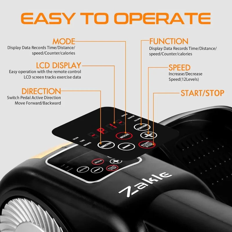 - 【LCD Display】Zakle portable under desk pedal exerciser with LCD display allows you to track speed, distance, counter, time and calories in real time. The senior-friendly seated pedal exerciser comes with a thoughtful remote control that lets you switch modes without bending over, taking the strain off your back. This means you can sit back and work or relax while still getting the workout you need!