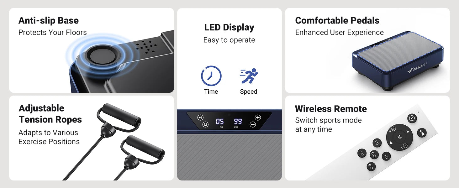 【Meet the training needs of different people】Vibration plate has 9 automatic modes and 99 speeds to choose from, which can meet the training needs of different people. In addition, it is equipped with 2 tension ropes to exercise all parts of the body. Using the included remote control or through the LED touch screen, the display allows you to check the time and speed and clearly understand your exercise situation.